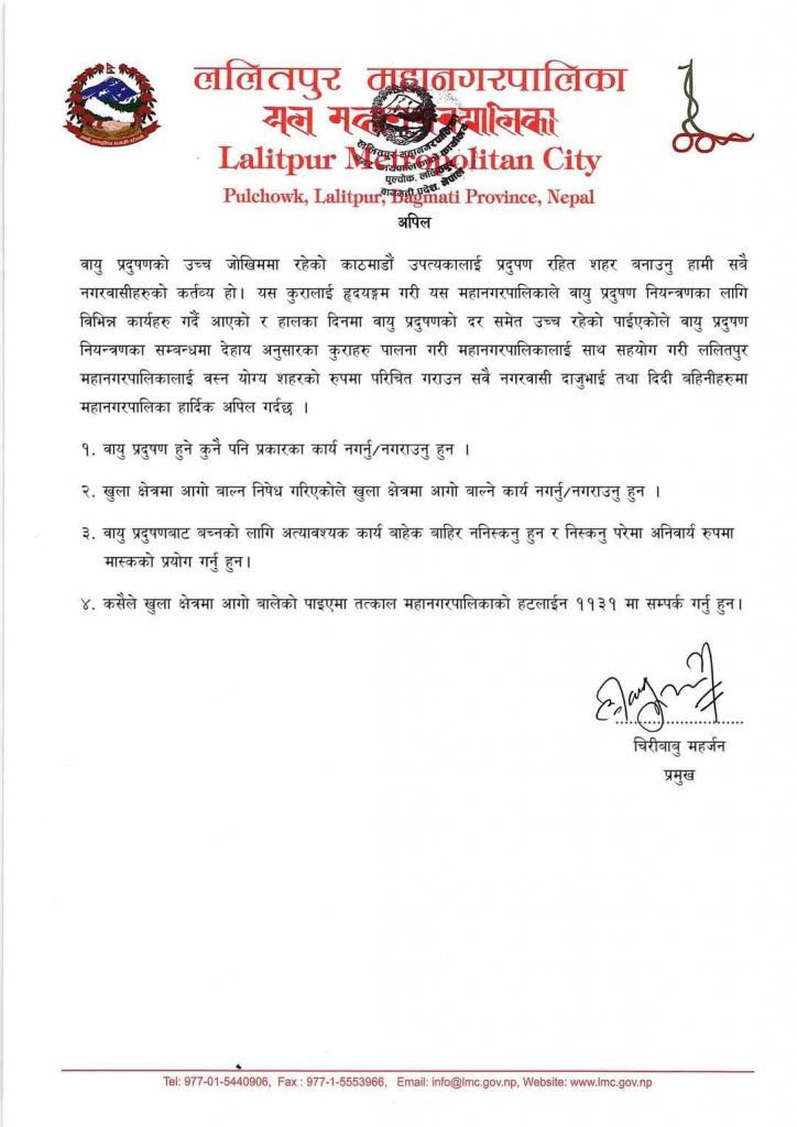 काठमाडौं । ललितपुर महानगरपालिकाका मेयर चिरीबाबु महर्जन प्रमुखले वायु प्रदूषण नियन्त्रणका लागि चार बुँदे अपिल गरेका छन् ।